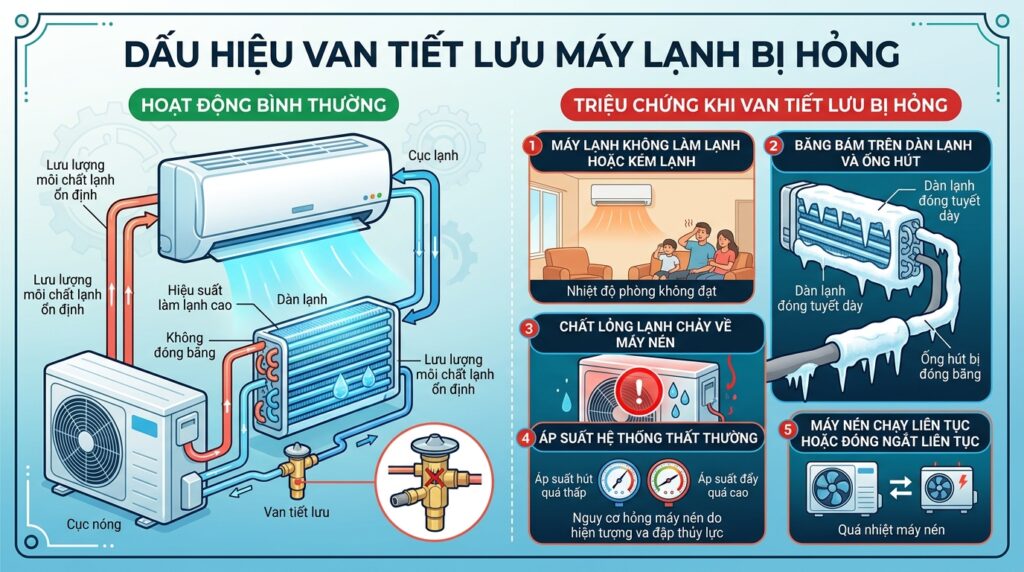 Khi van tiết lưu gặp sự cố, điều hòa sẽ xuất hiện một số dấu hiệu bất thường. Dưới đây là những biểu hiện phổ biến nhất mà bạn cần lưu ý: