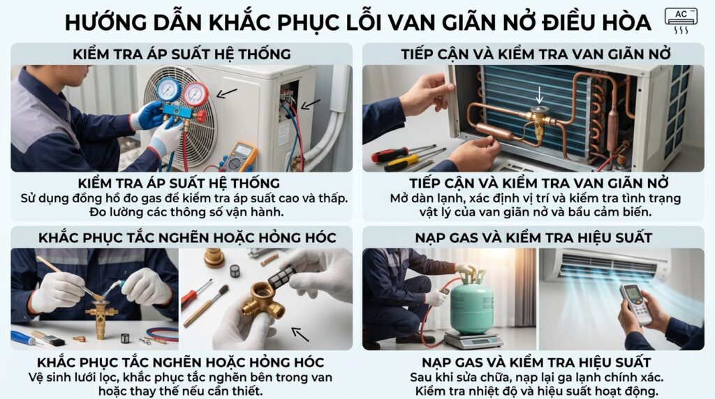 Khi phát hiện điều hòa có dấu hiệu bị lỗi van tiết lưu, bạn nên xử lý kịp thời để tránh ảnh hưởng đến hiệu quả làm lạnh cũng như tuổi thọ của thiết bị. Dưới đây là các bước khắc phục: