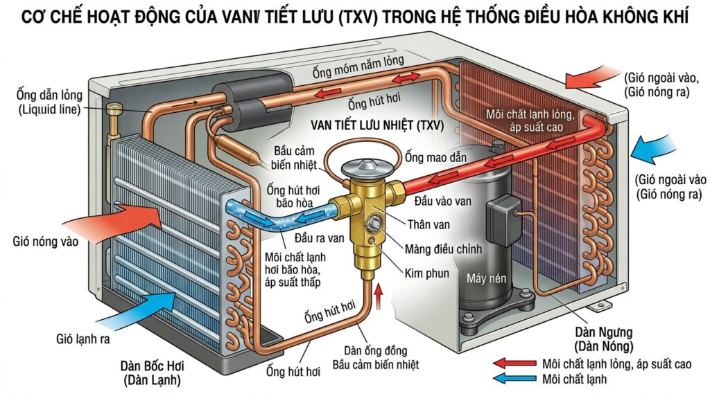 Trước khi đi vào chi tiết, hãy hiểu đơn giản về van tiết lưu. Đây là một bộ phận quan trọng trong hệ thống làm lạnh của điều hòa, có nhiệm vụ kiểm soát lượng môi chất làm lạnh (thường gọi là gas) đi vào dàn lạnh. Van tiết lưu giúp điều chỉnh áp suất và nhiệt độ của môi chất để quá trình làm lạnh diễn ra hiệu quả. Nếu van tiết lưu gặp sự cố, toàn bộ hệ thống làm lạnh của điều hòa sẽ bị ảnh hưởng nghiêm trọng.