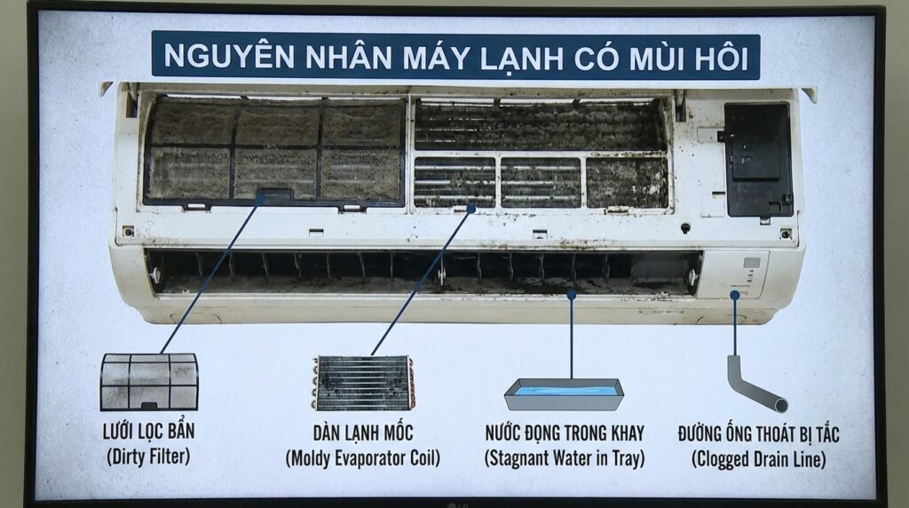 Điều hòa hoạt động liên tục sẽ hút không khí vào bên trong để làm lạnh. Nếu không được vệ sinh định kỳ, bụi bẩn và vi khuẩn sẽ tích tụ trong các bộ phận như dàn lạnh, bộ lọc, và đường ống dẫn khí. Đây là môi trường lý tưởng để vi khuẩn phát triển, gây ra mùi hôi.