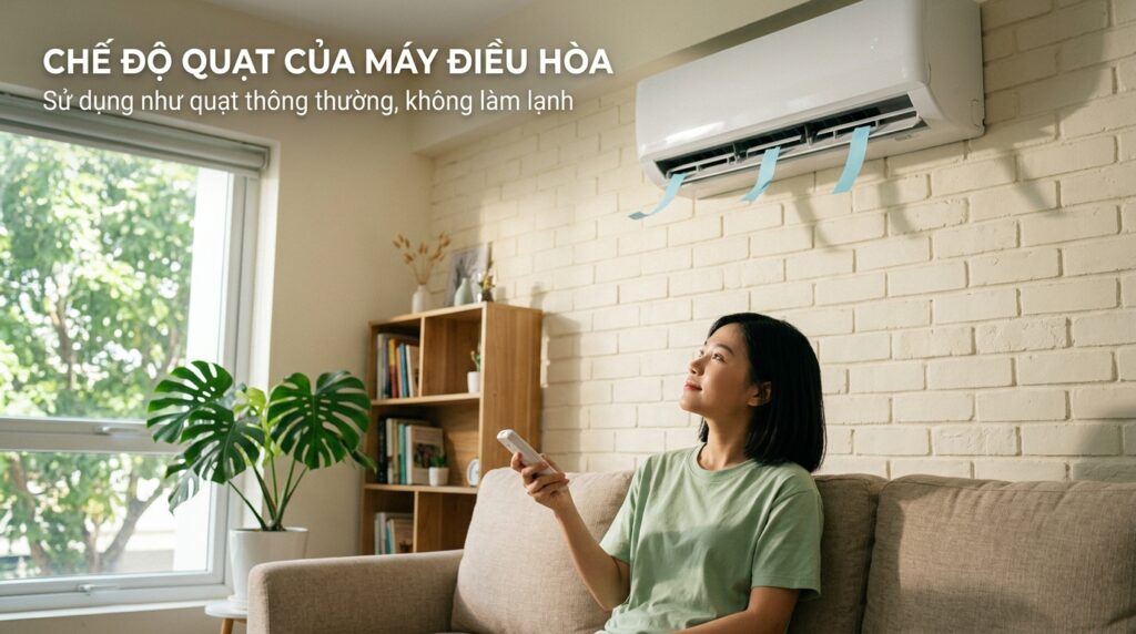 Chế độ quạt trên điều hòa là một trong những chức năng phổ biến, cho phép người dùng sử dụng điều hòa để lưu thông không khí trong phòng mà không cần kích hoạt chế độ làm lạnh hoặc sưởi ấm. Khi bật chế độ quạt, điều hòa sẽ hoạt động như một chiếc quạt thông thường, giúp không khí lưu thông tốt hơn và mang lại cảm giác thoải mái mà không tiêu tốn nhiều điện năng.