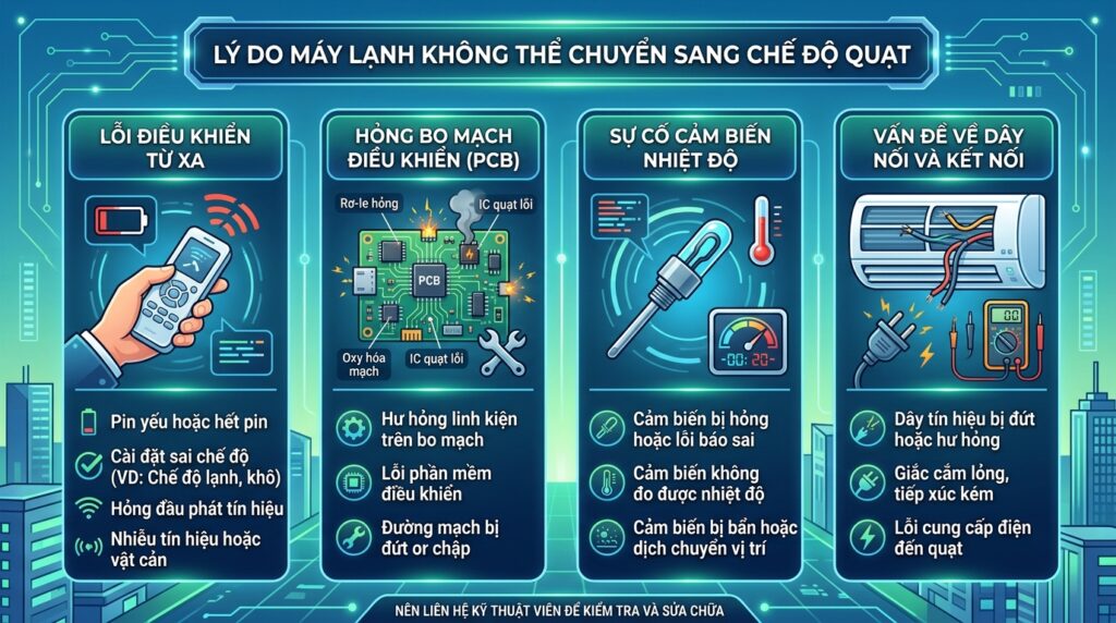 Có nhiều lý do khiến điều hòa không thể bật chế độ quạt. Dưới đây là những nguyên nhân phổ biến nhất:
