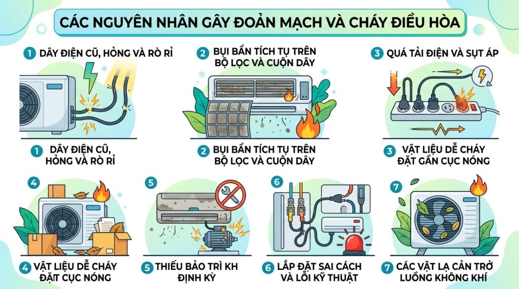Có rất nhiều nguyên nhân dẫn đến hiện tượng chập cháy ở điều hòa, nhưng chủ yếu bao gồm: