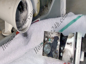 – Kiểm tra lưới lọc: bộ phận này cần kiểm tra trước tiên, toàn bộ rác từ quần áo như cúc áo, giấy vụn, tóc, chun buộc tóc, chất bẩn….đều được lọc lại tại lưới lọc máy giặt. Lâu dần, lưới lọc sẽ bị tắc và nước xả không thể đi qua khi bơm hút, chúng ta cần kiểm tra bộ phận này trước tiên, hãy mở nắp ở góc mặt trước gần đế máy để kiểm tra và làm sạch lưới lọc. Trên hình là lưới lọc đã bị tắc bởi rác từ quần áo.