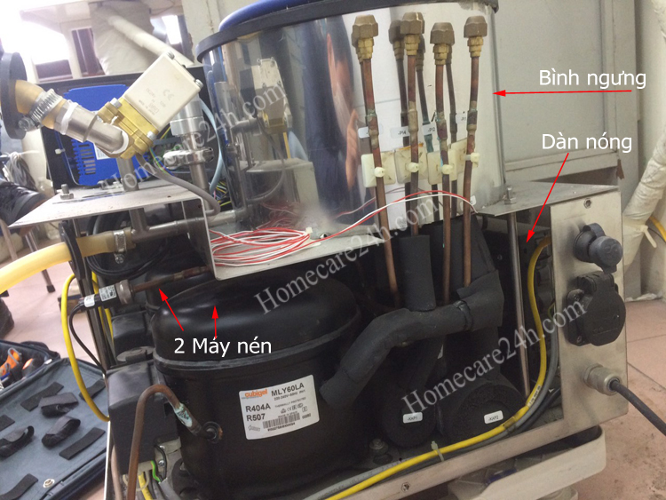 Hình ảnh trên chính là cấu tạo máy đông khô bên trong lớp vỏ kim loại sau khi đã tháo ra. Khoang ngưng tụ nước có hình dạng giống như lòng nồi cơm điện vậy, tại đây, bề mặt kim loại có độ lạnh tới -60oc hoặc thấp hơn sẽ ngưng tụ hơi nước thoát ra từ sản phẩm đặt tại buồng kính trong phía trên, không khí khô được hút qua các lỗ nhỏ trên thanh tròn ở giữa bình ngưng. Các bộ phận xung quanh là các thiết bị điện và điều khiển, hệ thống lạnh âm sâu được đặt ở khoang dưới.